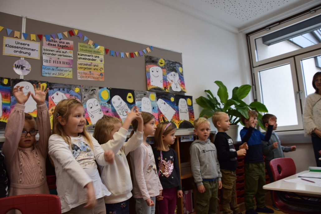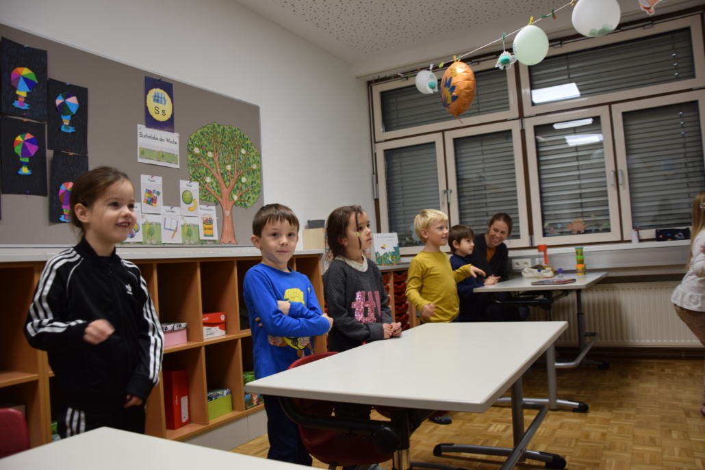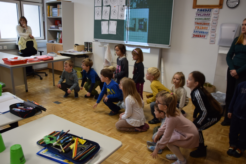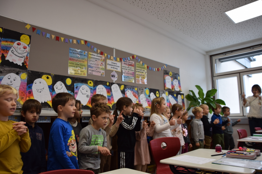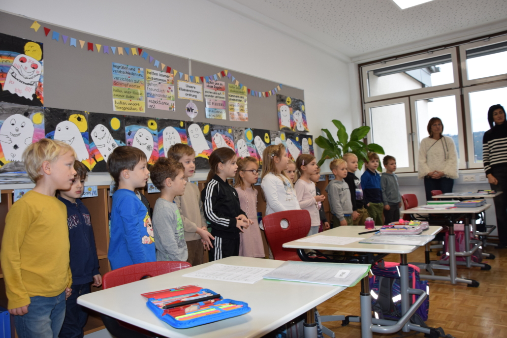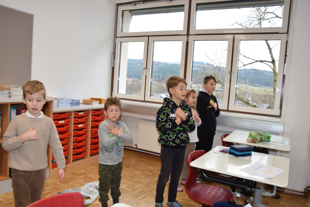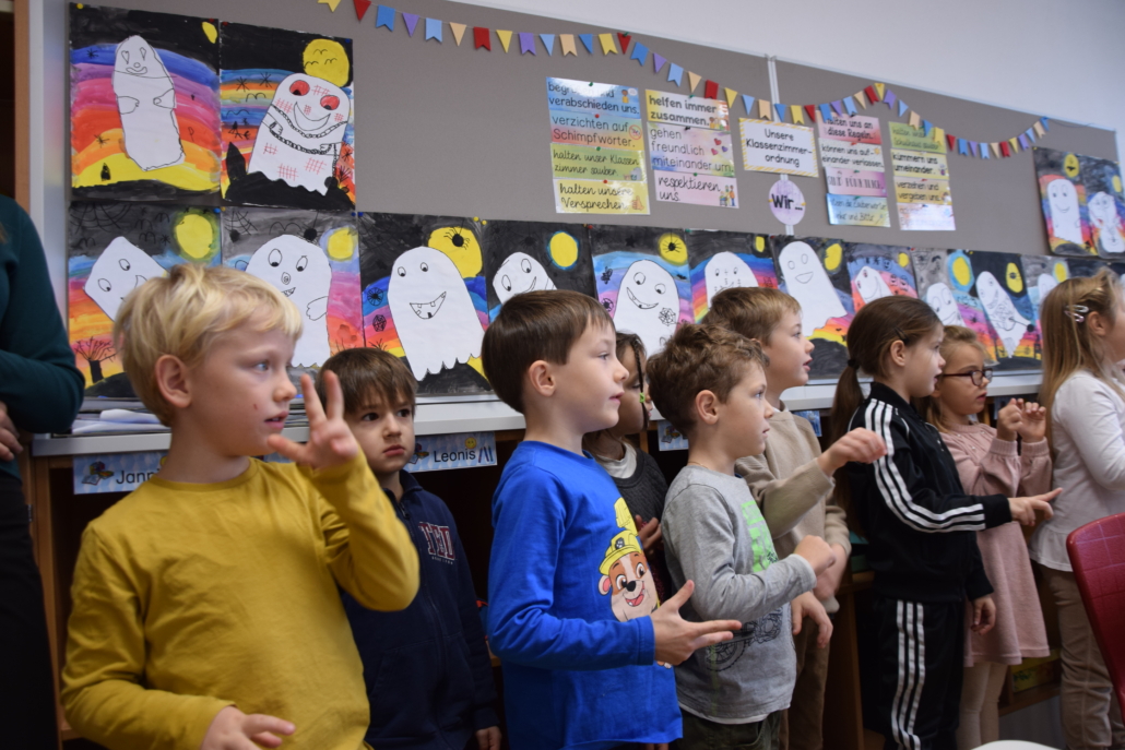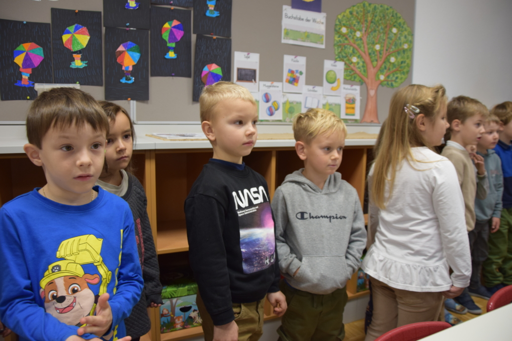 Jede Klasse, von der 1.- bis zur 4. Stufe begrüßten unsere Kinder mit Liedern, Tänzen und einem Gebet.